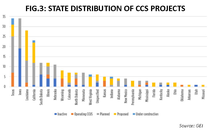 This geographic concentration reflects a strategic pivot; developers favour regions with geology, permitting authority and industrial emitters co-located to achieve economies of scale. Fig.3 provides a full picture of CCUS projects by state and status.