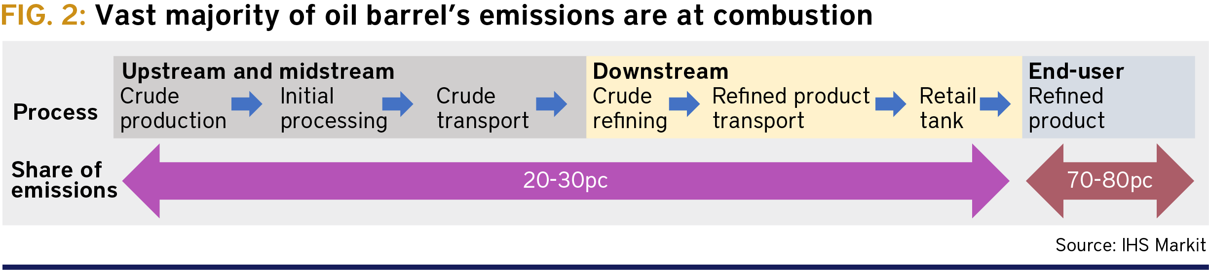 Another vexed question is the appetite of the end-user to participate in bearing any responsibility for the carbon footprint of products they consume. This gets to one of the thornier issues in the debate—upstream production and downstream refining accounts for only c.20-30pc of the carbon footprint of a barrel of oil, according to IHS Markit (see Fig.2). The vast majority, c.70-80pc, of the CO₂ emitted, is in the combustion phase, by industrial end-users and transportation firms, but also by individuals.