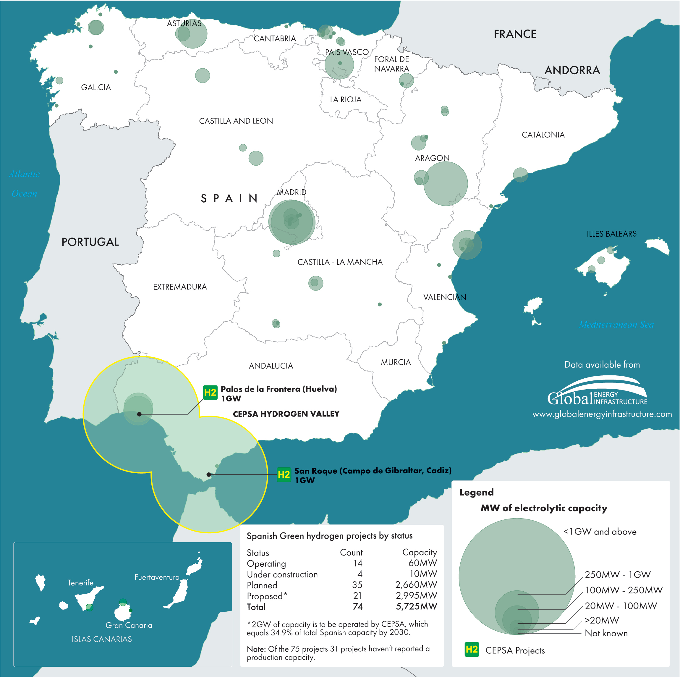 Spain also has an unusually well interconnected grid, which means that green electrons can be sent to and from various different parts of the country, depending on where the wind is blowing and the sun is shining. This can help make hydrogen production more efficient.