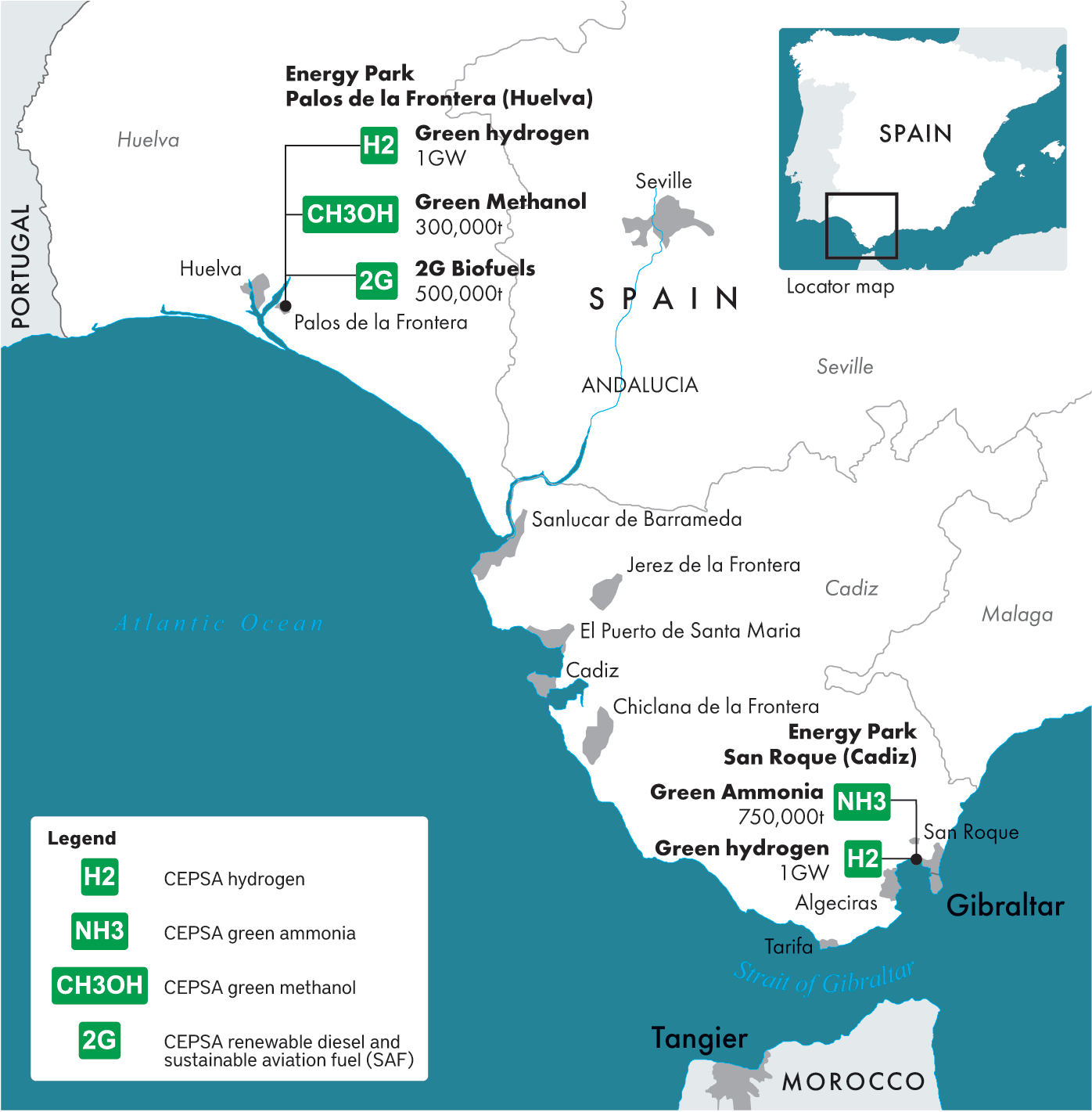 In addition to supplying clean energy for Spain, the development of the Andalusian Green Hydrogen Valley will also enable Cepsa to become an exporter of green hydrogen. The valley is well positioned to have access to deep water ports at Huelva and Algeciras that already have some infrastructure in place.