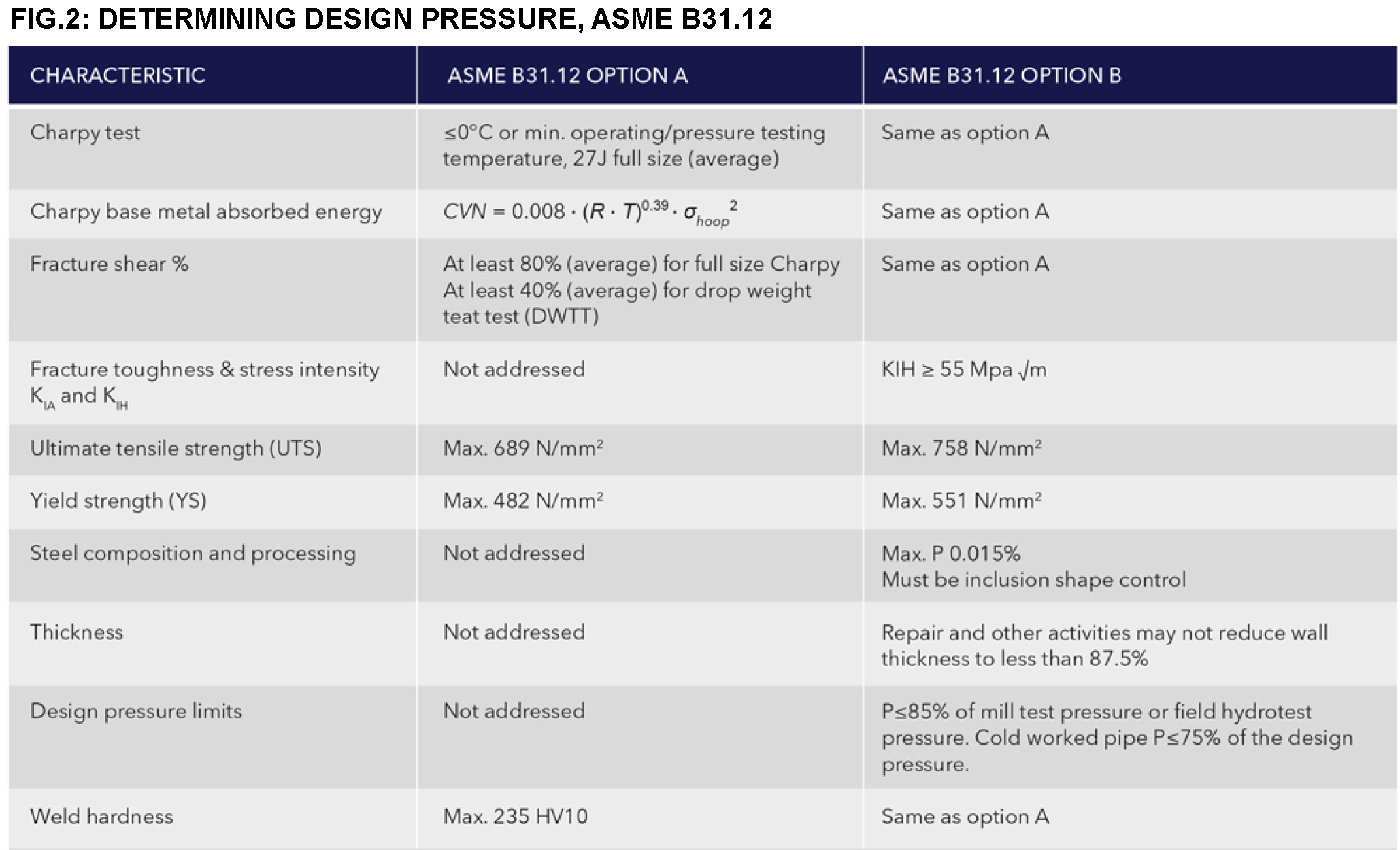 To properly assess whether a pipeline system can be repurposed, operators need to define the content of hydrogen in the blend and the requirements for the pipeline material and compare this with existing natural gas code requirements. ASME B31.12 offers two options for determining design pressure: a prescriptive option (A) and a performance-based option (B). Each option has different material requirements (see Fig.2).