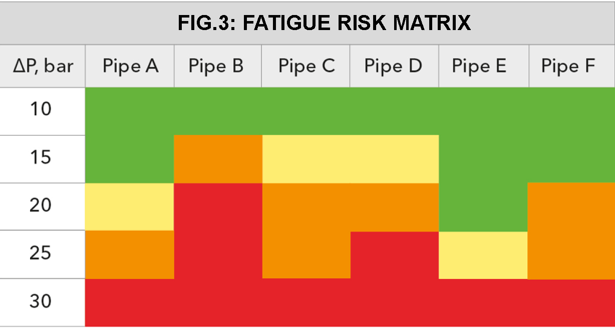 To manage the fatigue risk for repurposed natural gas pipelines, operators can develop a fatigue risk matrix considering the crack growth per cycle and the number of cycles per given period (see Fig.3). The fatigue risk matrix should consider the current integrity of the pipeline and operating conditions, the determined threshold pressure value, and the new working conditions expected when transporting hydrogen.