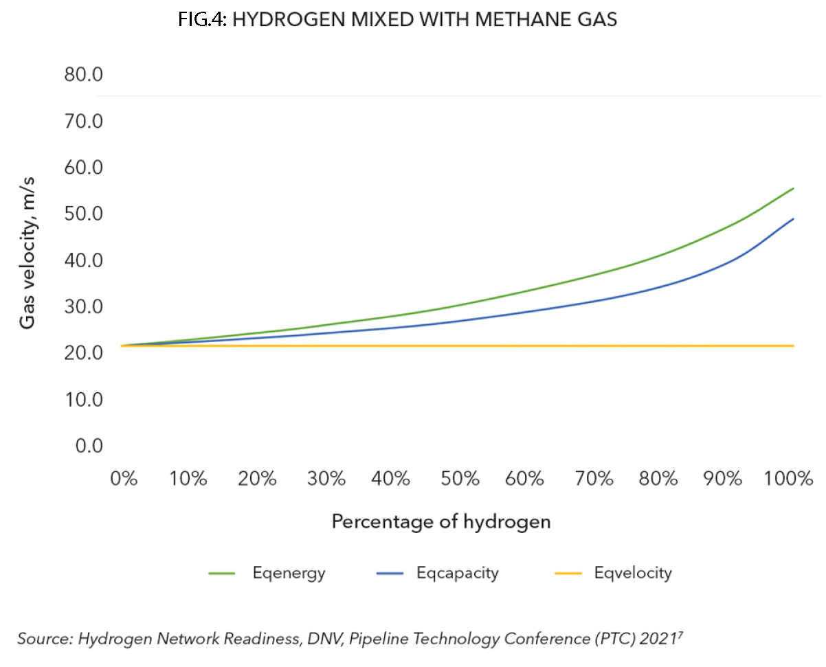 - Equal energy flow: the velocity of pure hydrogen would need to be three times that of natural gas.