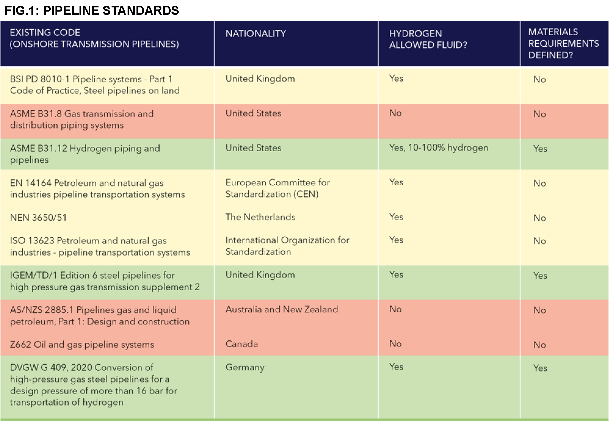Existing pipeline infrastructure has been designed for transporting natural gas. Industry standards govern the construction and operation of natural gas pipelines (see Fig.1), along with local regulations. However, the codes in place provide limited guidance on the design and use of hydrogen in existing pipelines. The commonly cited design practices for hydrogen pipelines are based on the ASME B31.12 standard. However, some ASME requirements are likely to be conservative as they are based on sour service (containing hydrogen sulphide) design guidance.