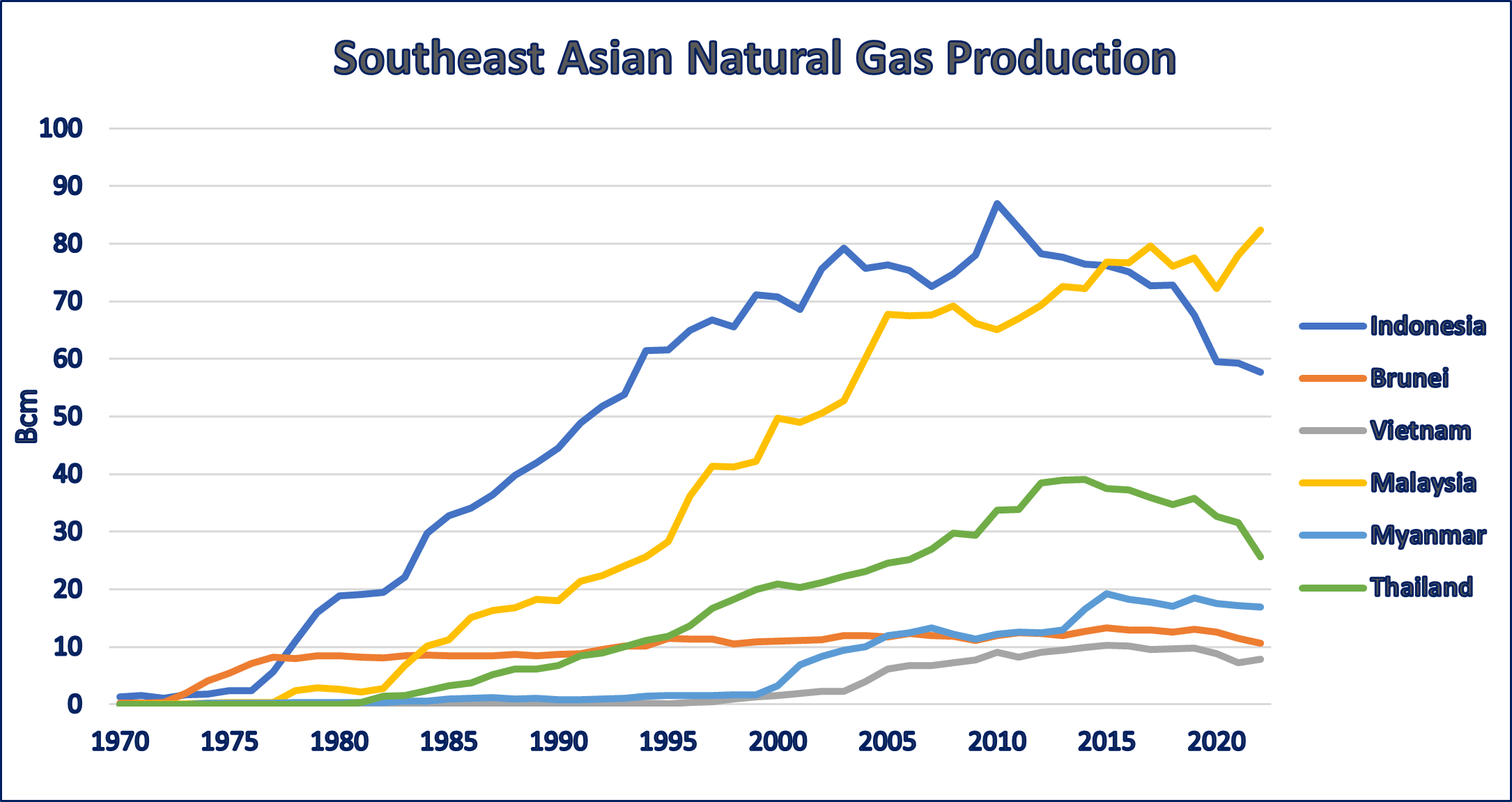 The backdrop to this expansion is fast-growing economies and declining natural gas production. Southeast Asia is endowed with substantial natural gas resources with few outlets for export beyond the region. As a result, since the 1970s and 1980s when production began climbing, natural gas has played an important role in the region’s energy mix. This is particularly true for electricity generation, with gas’s share electric generation peaking as high as 75% in Thailand in 2010. However, since c.2010, gas production has stagnated or begun declining across most of the region.
