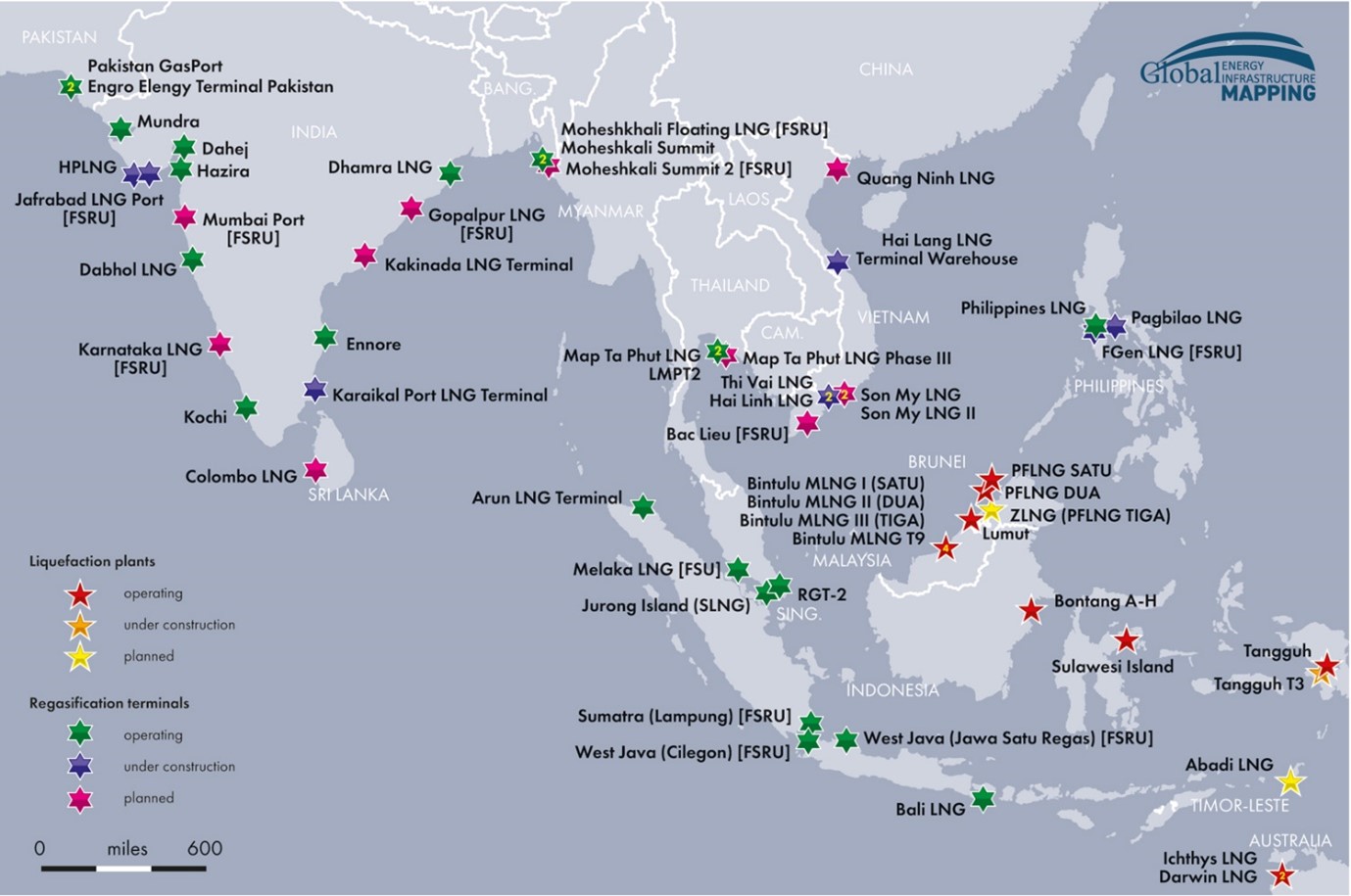 Prior to 2023, Southeast Asian LNG infrastructure was largely concentrated in Thailand, Malaysia, and Indonesia, which are also the region’s largest gas producers. Indonesia and Malaysia have invested in significant LNG liquefaction capacity, and along with the tiny Sultanate of Brunei, they have 70m t/y of liquefaction capacity, or about 15% of global capacity.
