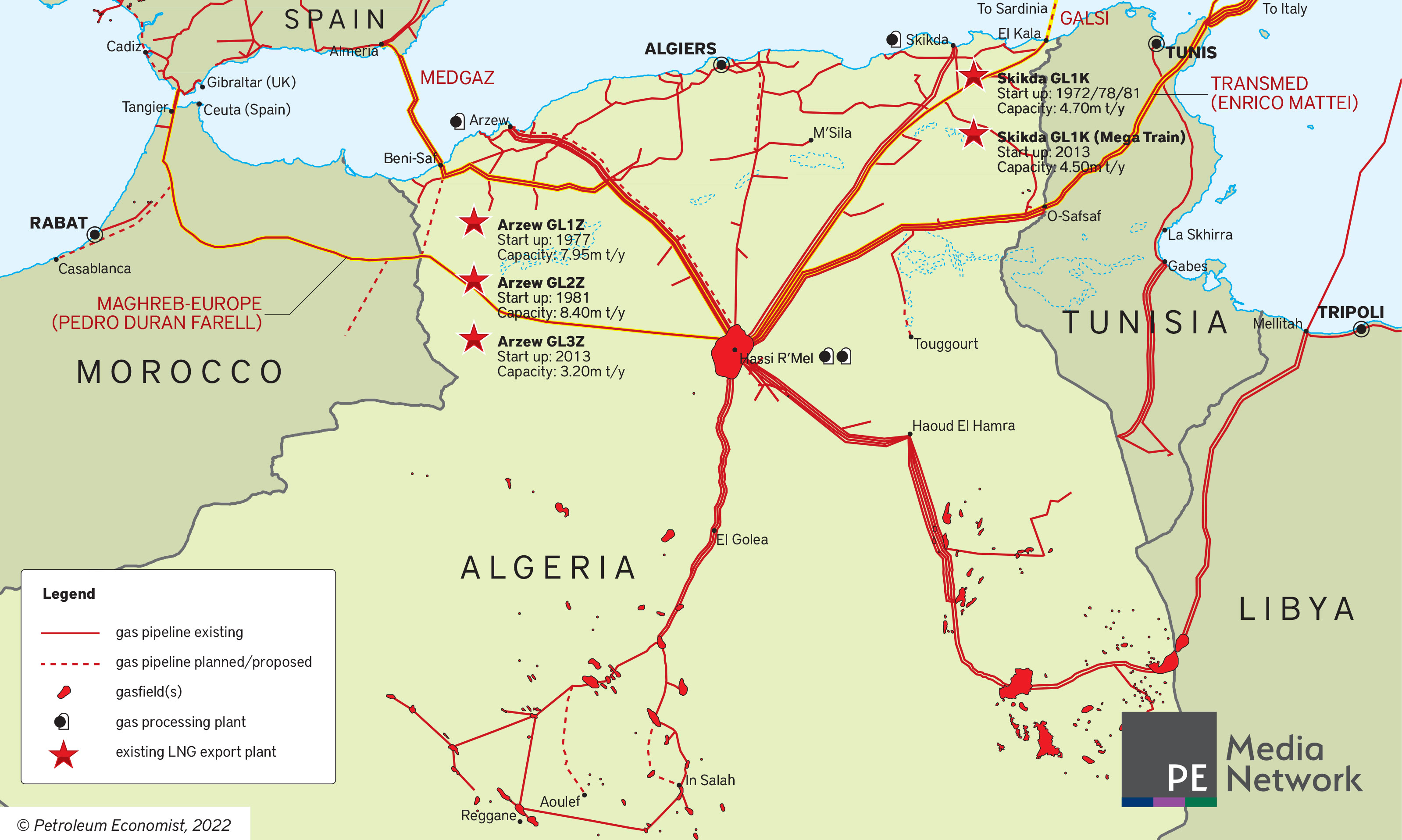 Algeria supplied Spain with 15.8bn m³ of gas via pipeline, as well as 2.4bn m³ of LNG shipments, in 2021. With a total capacity of 30bn m³/yr, the Trans-Mediterranean (Transmed) pipeline does not offer an alternative route to deliver all of this gas to non-Spanish consumers in Europe, given it already pumps at least 19.5bn m³/yr to Tunisia and Italy.