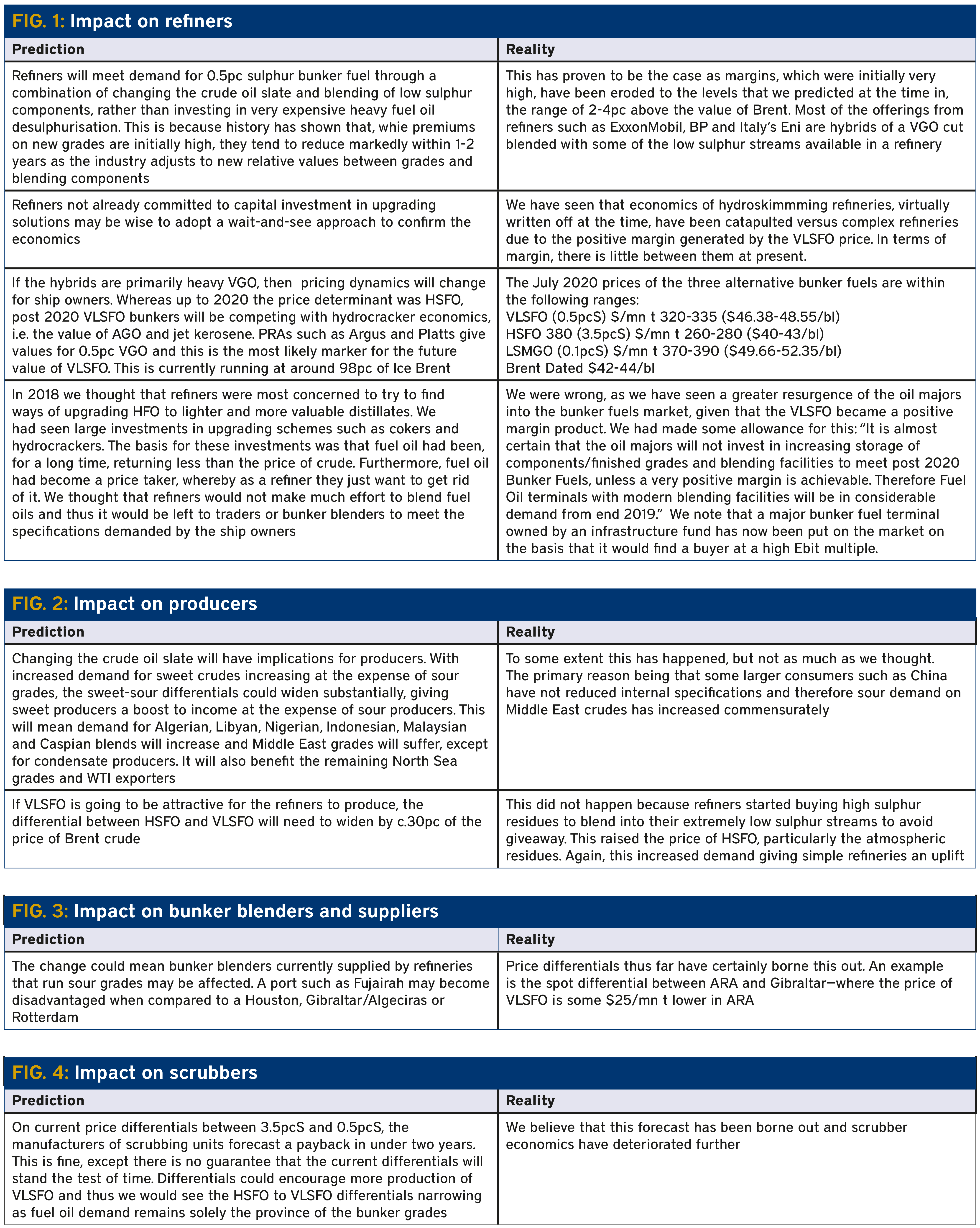 Channoil revisited some work it did in 2018 on potential IMO 2020 impacts and looked in some depth at what it got right and wrong on the potential implications for various types of stakeholders compared with what we have seen so far (see Figs. 1-4).