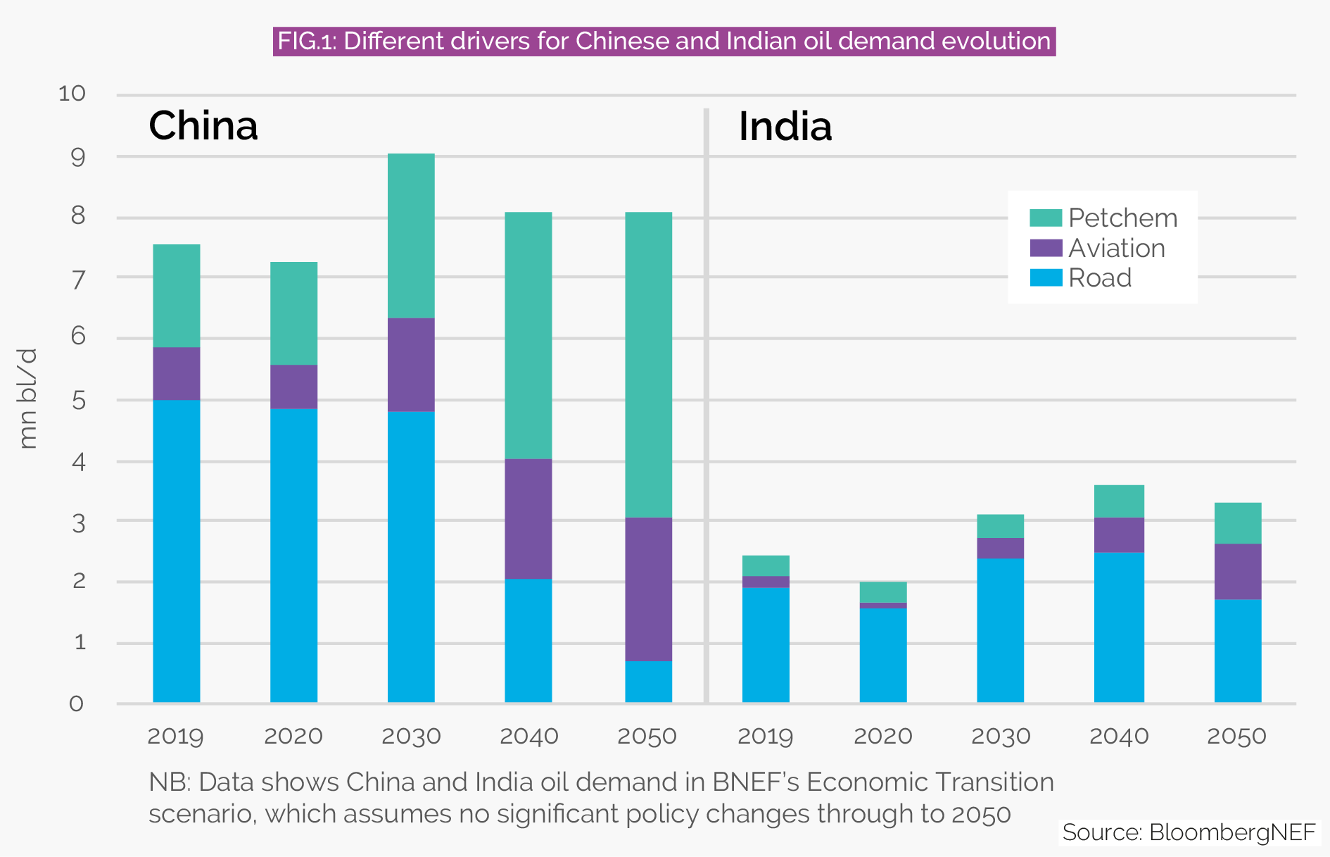Both countries will continue to see oil consumption rise before peaking, but—according to BloombergNEF’s Economic Transition scenario, which assumes no significant policy changes through to 2050—the composition of their future barrels will be quite different (see Fig.1), making adaptation vital for survival and success in the sector.