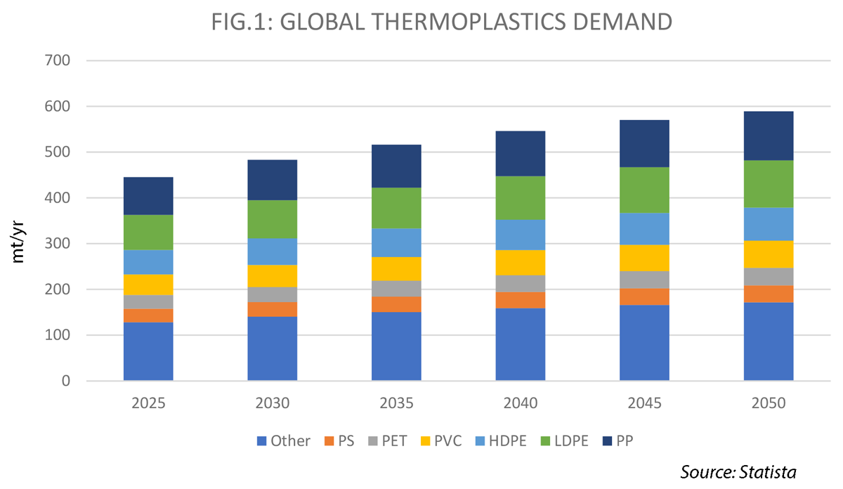 Global thermoplastic demand is expected to increase to 2050, amounting to nearly 590mt/yr (see Fig.1). Most of this increase is attributed to a stark increase in non-OECD Asia, primarily due to a surge in Asia’s middle class. In 2020, more than 3.5b people were considered part of the consumer class—i.e., those that spent around $12/d in 2017 purchasing power parity—according to thinktank the Brookings Institution and figures from data enterprise World Data Lab. Of these 3.5b people, half are in Asia, which is a significant increase since 2000, when 70% of the consumer class was in OECD countries—primarily in the West. By 2030, the size of the consumer class is forecast to increase to nearly 5b, with Asia comprising the bulk of the growth. This socioeconomic class has more purchasing power for many goods made with petrochemicals. The significant rise in Asian citizens entering the consumer class will be the driving force for petrochemicals through the rest of the decade.