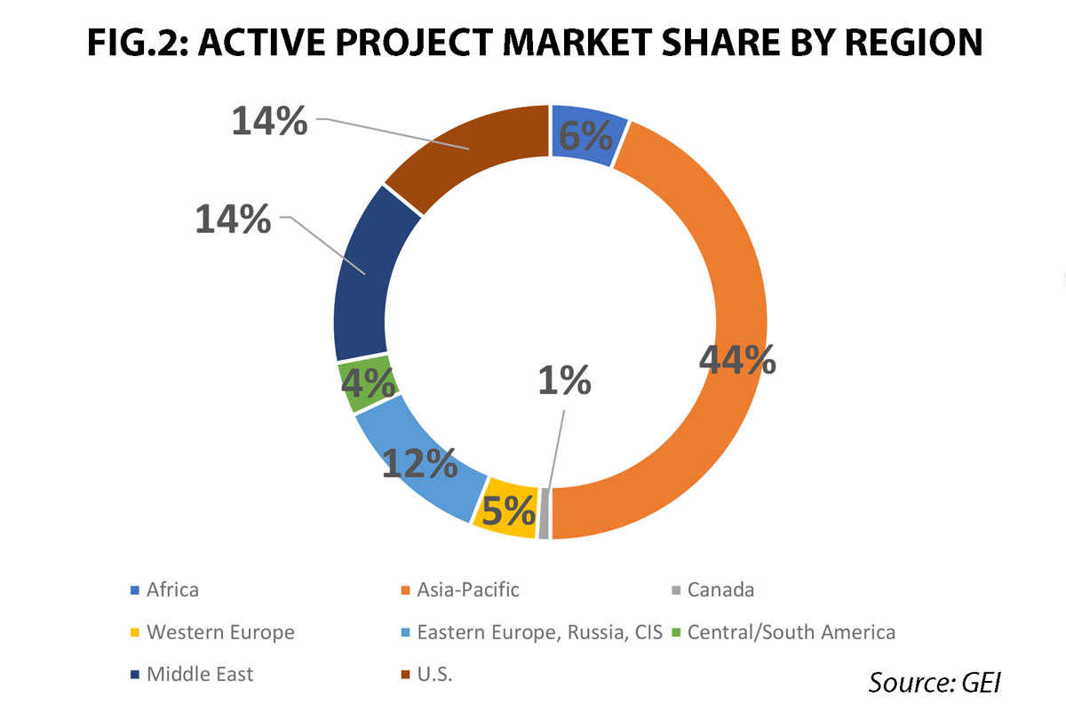 Additional processing capacity will be required globally to satisfy forecast demand for petrochemical products. More than 530 petchems projects are underway around the world, according to Gulf Energy Information’s Global Energy Infrastructure database. More than 40% of these are in the Asia-Pacific region, followed by the Middle East and the US. These three regions represent more than 70% of active petrochemical projects globally (see Fig.2).