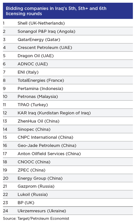 Not all areas attracted bids. Those that didn’t were the Anbar, Okashat, Anah and al Anz blocks in Anbar province; the Pulkhana field in Salahuddin province; Tel Al Hajar block in Nineveh province; Block 11 in Muthana province; and Qalaat Salih block in Maysan province. On the other hand, with the 22 oil company bids attracted for the 29 blocks on offer, including majors Shell and BP, it is evident there is still ample heavyweight interest in Iraq’s upstream.